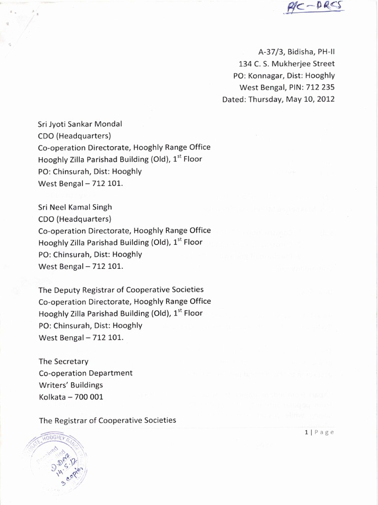 Complaint Letter Submitted To The Deputy Registrar Of Co Operative Societies Government Of West Bengal On Monday 14 May 2012 Judiciaries Crime Thriller